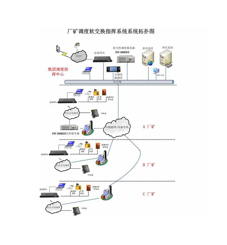 廠礦調(diào)度軟交換指揮系統(tǒng),集團(tuán)中心放置軟交換服務(wù)器。A、B、C等分廠、分礦等作為接入終端。終端使用設(shè)備可以接入模擬行政電話、抗噪聲電話、擴(kuò)音電話等。在集團(tuán)中心可以實(shí)現(xiàn)對(duì)各個(gè)分廠的呼叫、廣播、錄音、電話會(huì)議、集呼、組呼、點(diǎn)呼、強(qiáng)拆、強(qiáng)插等各種功能。