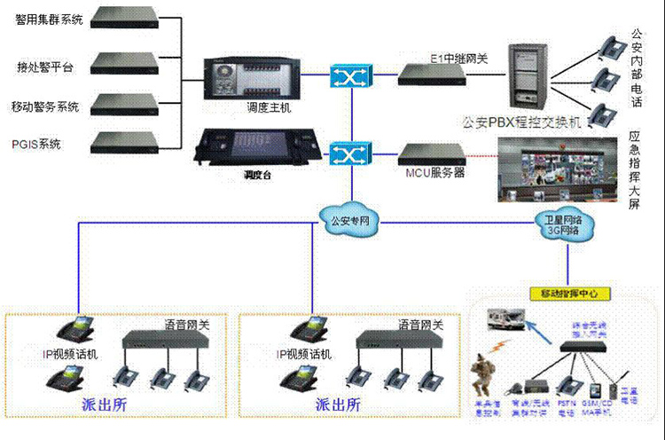 以市公安局為核心架設(shè)一臺軟件換調(diào)度主機(jī)(SW-2000DS),各派出所、警務(wù)室為節(jié)點放置語音網(wǎng)關(guān)和IP視頻話機(jī),建設(shè)多媒體指揮調(diào)度系統(tǒng)。通過整合公安局的辦公通信系統(tǒng)、350兆警用集群系統(tǒng)、視頻會議系統(tǒng)等通信系統(tǒng),以及PGIS系統(tǒng)、接處警平臺、移動警務(wù)系統(tǒng)等業(yè)務(wù)系統(tǒng),構(gòu)建集語音、視頻、數(shù)據(jù)于一體的多媒體融合調(diào)度平臺。多媒體指揮調(diào)度系統(tǒng)以市公安局為一級應(yīng)用平臺,在市局部署多媒體指揮調(diào)度系統(tǒng)的核心設(shè)備,通過專用的E1中繼網(wǎng)關(guān)接入PSTN、GSM/WCDMA/3G/衛(wèi)星等各種公共通信網(wǎng)絡(luò),實現(xiàn)內(nèi)部通信系統(tǒng)與公網(wǎng)系統(tǒng)的互聯(lián)互通。市局下屬各派出所、警務(wù)室部署IP話機(jī)等語音終端,通過公安專網(wǎng),接入市局指揮調(diào)度平臺。