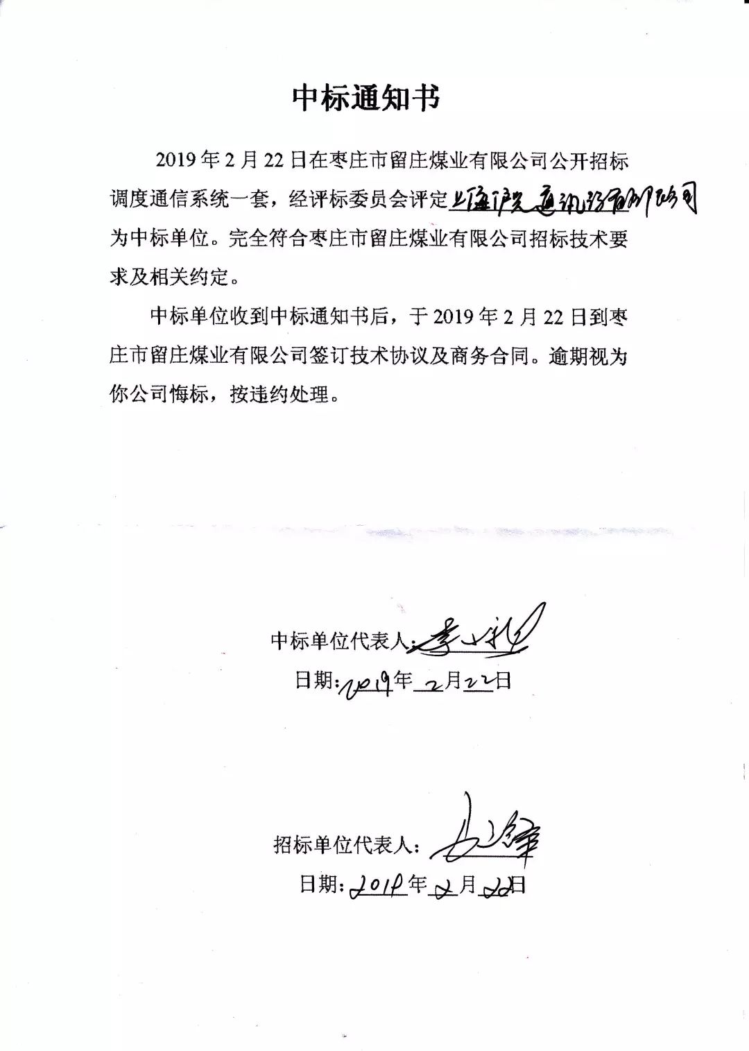 我公司在棗莊市留莊煤業(yè)有限公司招標(biāo)項目中中標(biāo)