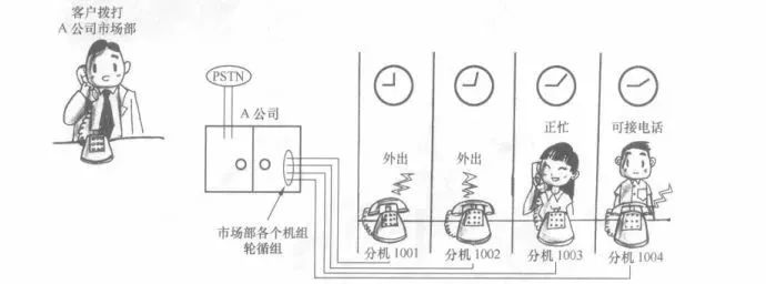 若干個分機形成一個組,當一個電話呼叫其中分機的時候,該分機占線,PBX自動轉(zhuǎn)到下一個分機,若在占線,繼續(xù)轉(zhuǎn)到下一個分機去,直到某個分機接聽,或者所有分機占線。
