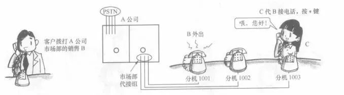 若干個分機形成一個組,其中一個人不在座位,無法接聽,別人可以操作某些按鍵,在自己的座位就可以代他接電話。這種組一般放在同一個部門的情況下。