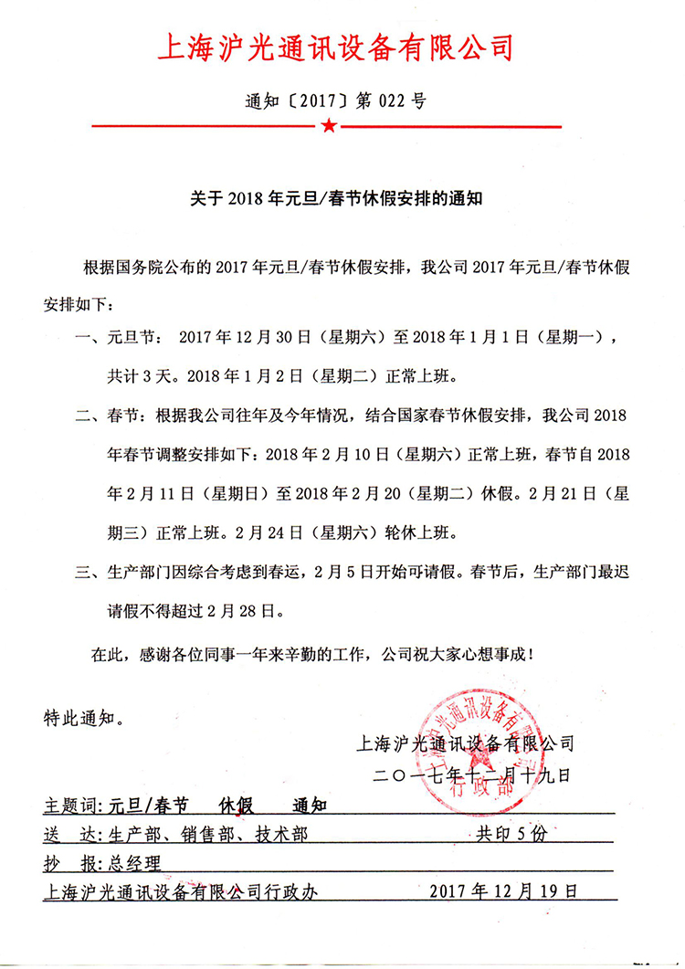 公司關(guān)于2018年元旦/春節(jié)休假安排的通知